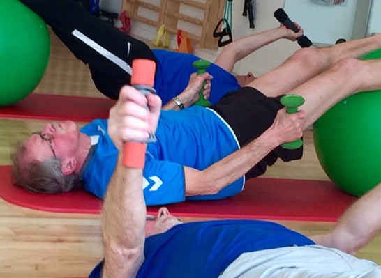 Vi arbejder med bevægelighed, styrke, balance, kondition og koordination samt bækkenbundstræning, så vi får hele kroppen arbejdet igennem.